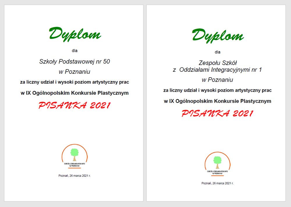 Uczniowie klas 1-3 licznie wzięli udział w IX Ogólnopolskim Konkursie Plastycznym – PISANKA 2021. Konkurs został zorganizowany przez Ogród Jordanowski nr 2 w Poznaniu i objęty patronatem honorowym przez Muzeum Narodowe Rolnictwa w Szreniawie. Uczniowie wykazali się nieprzeciętną kreatywnością. Wszystkim uczestnikom konkursu dziękujemy za udział.