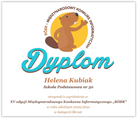 Miło nam poinformować, że w tegorocznej XV edycji Międzynarodowego Konkursu Informatycznego Bóbr 3 uczniów naszej szkoły uzyskało wyróżnienie.
